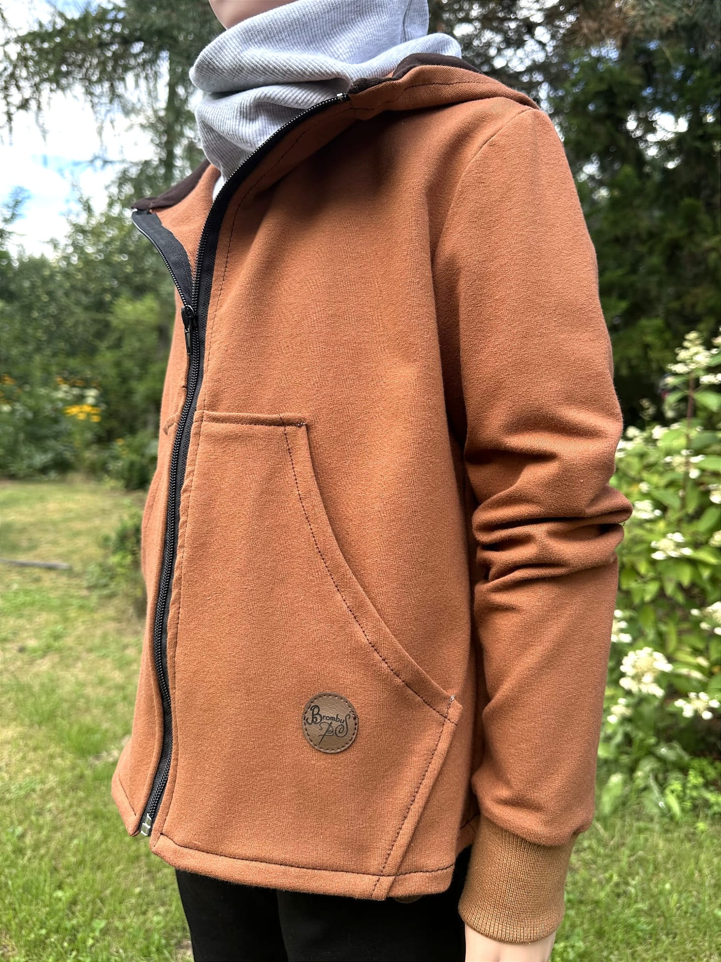Na dole znajduje się subtelna naszywka z logo BrombuŚ, która podkreśla ręczne wykonanie i unikatowość produktu.