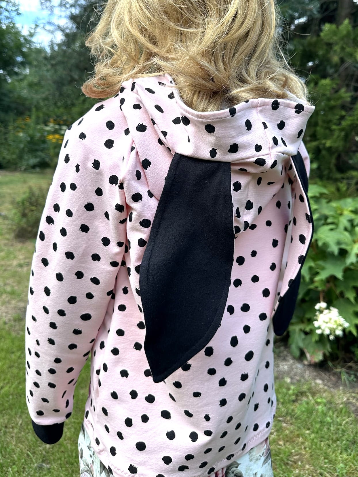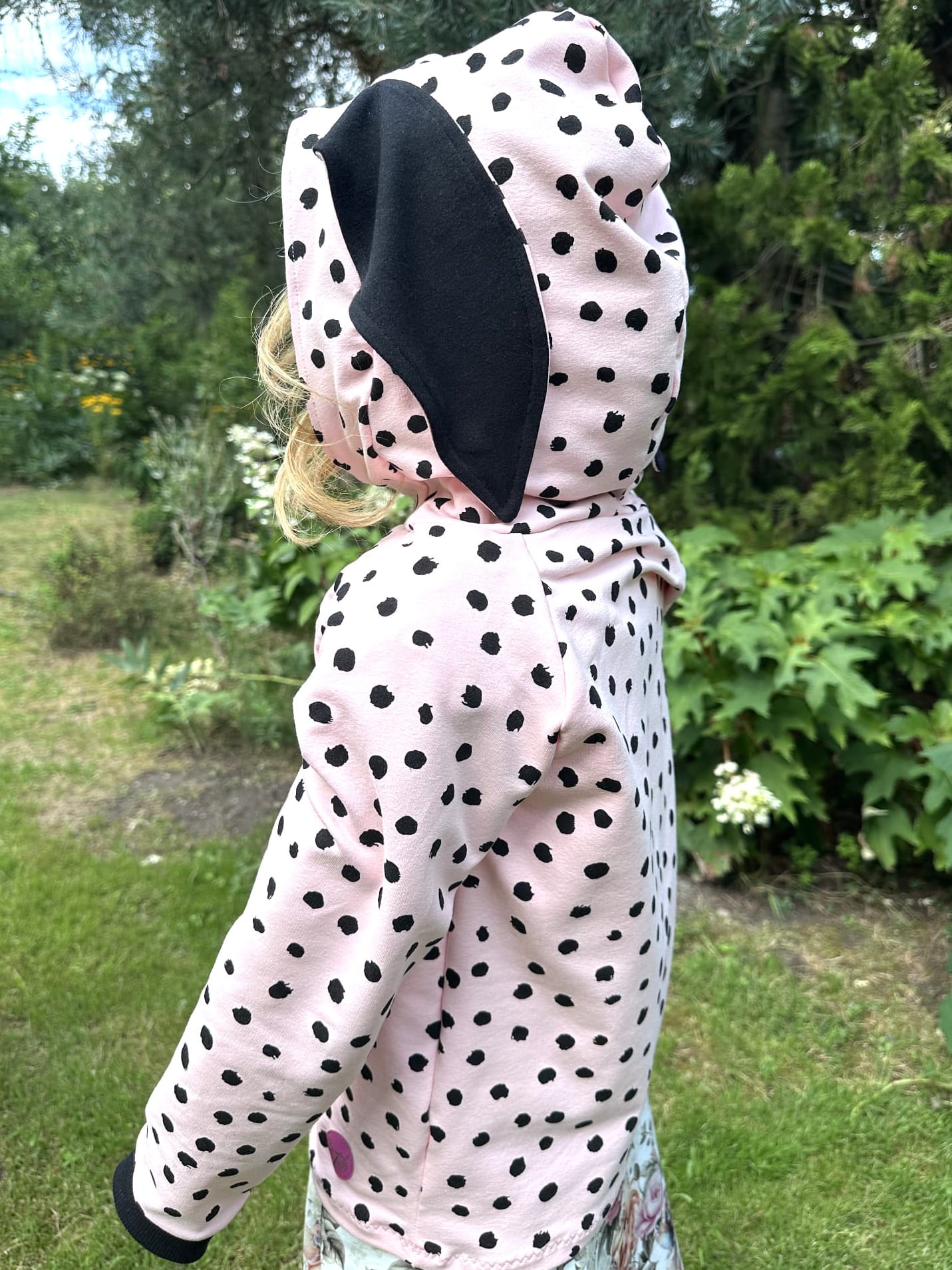Design oparty na klasycznym kroju z kapturem, ale z wyjątkowym akcentem – uroczymi czarnymi uszami wszytymi w kaptur. Całość utrzymana w pastelowym różu z zabawnym czarnym wzorem w groszki. Ściągacze na rękawach zapobiegają podwijaniu się materiału i zwiększają wygodę noszenia.