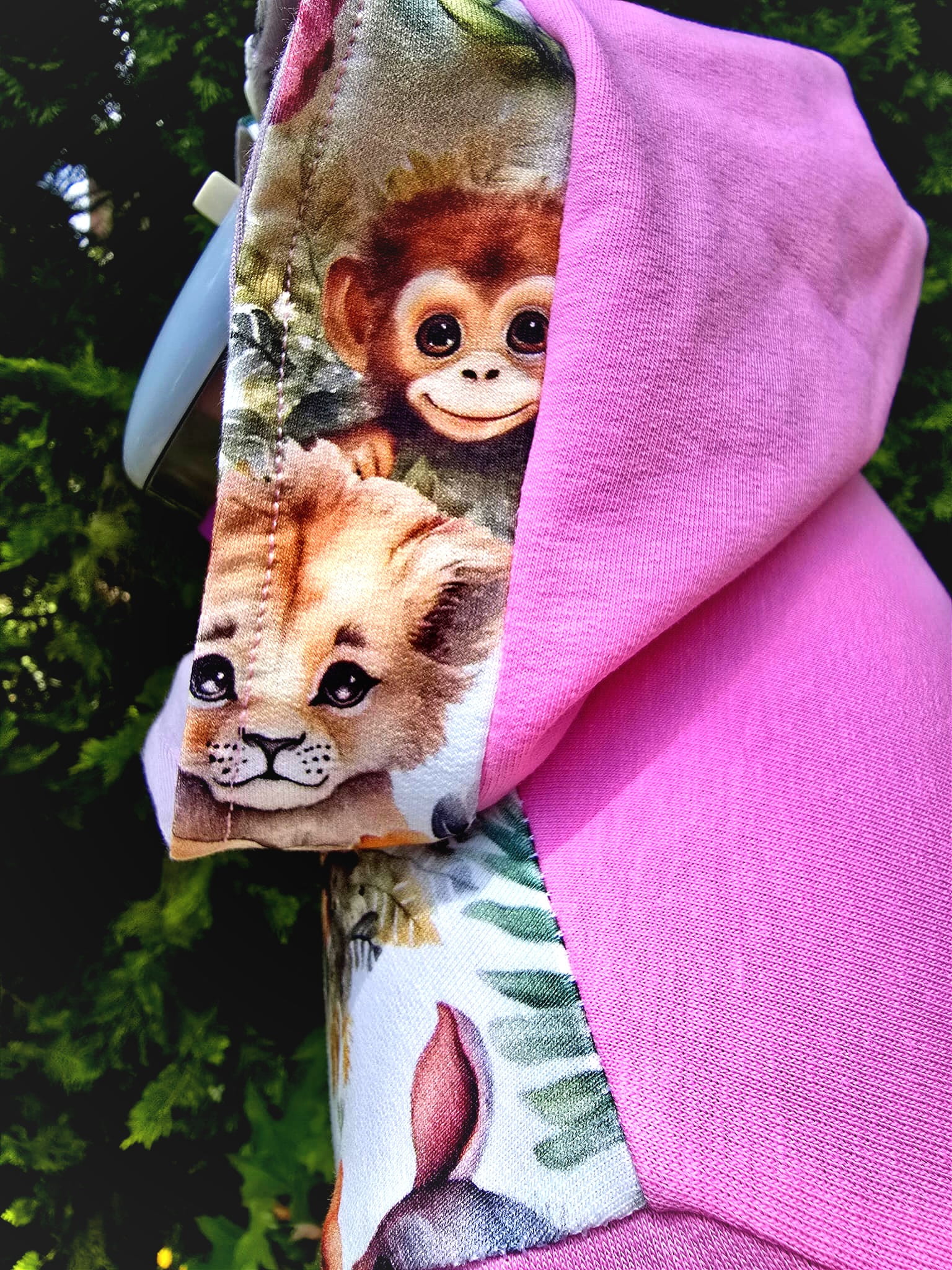 Uszyta ręcznie z dresówki (bawełna z elastanem), bluza jest miękka, elastyczna i przyjazna dla skóry. Różowa baza świetnie komponuje się z kolorowym panelem, a kaptur i kieszeń typu kangurka dodają praktycznego charakteru.