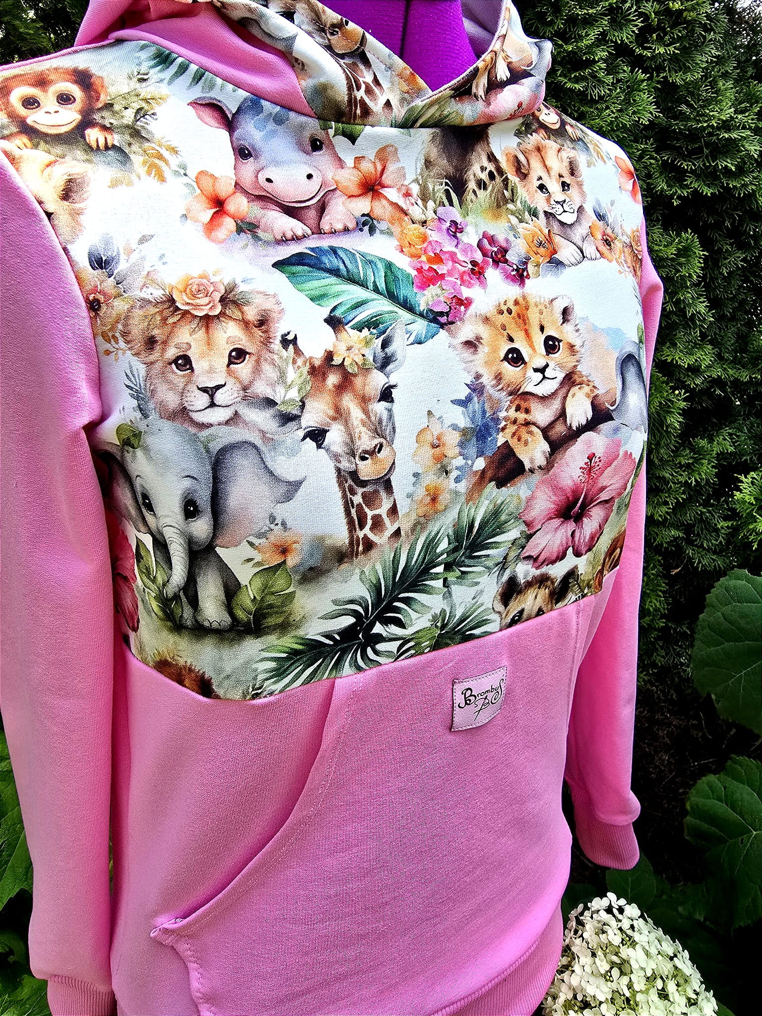 Bluza Dżungla Malucha to wyjątkowa propozycja dla dziewczynek, które kochają naturę, zwierzęta i bajkowe klimaty. Motyw słodkich lwiątek, żyrafek, hipopotamów i kwiatów sprawia, że bluza wygląda jak ilustracja z pięknej książki.