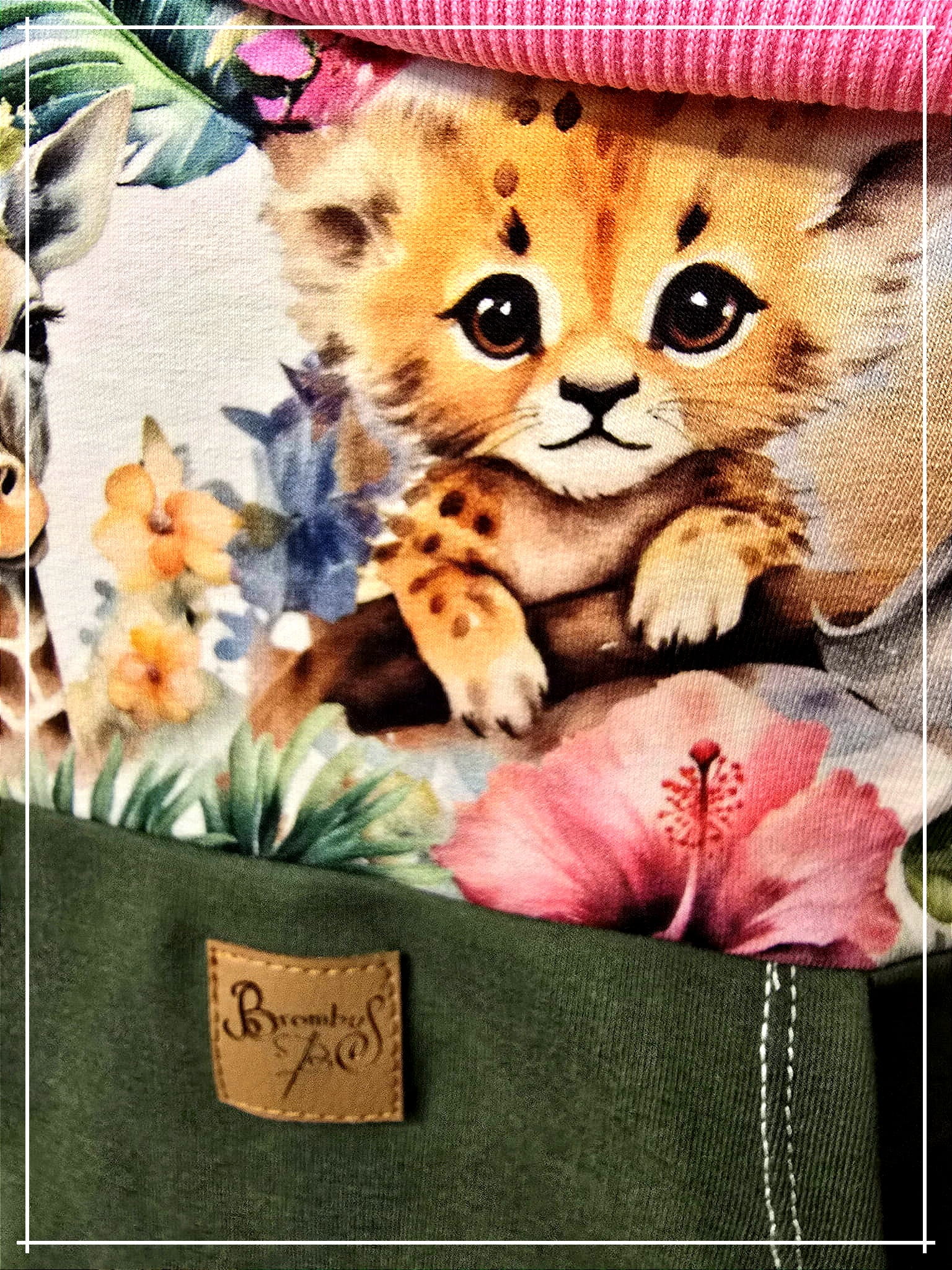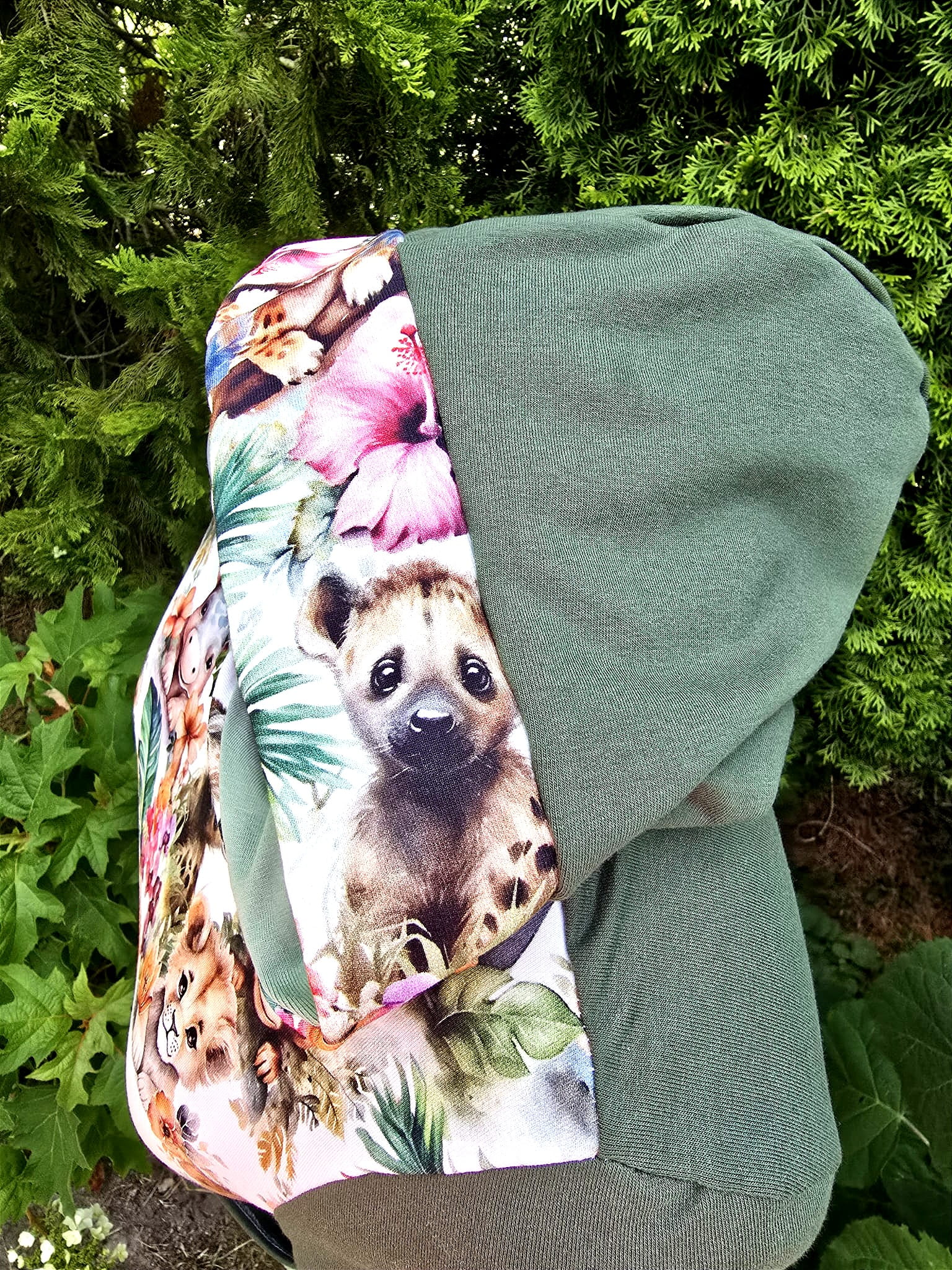 Ta ręcznie szyta bluza dziecięca to połączenie wygody i wyjątkowego stylu. Gładka, khaki dresówka stanowi bazę dla uroczego panelu z tropikalnymi zwierzętami – lwiątkami, żyrafkami, hipciem, małpką i innymi przyjaciółmi z dżungli. Kaptur z ozdobną podszewką oraz kieszeń typu kangurek dodają całości praktyczności i dziecięcego charakteru.