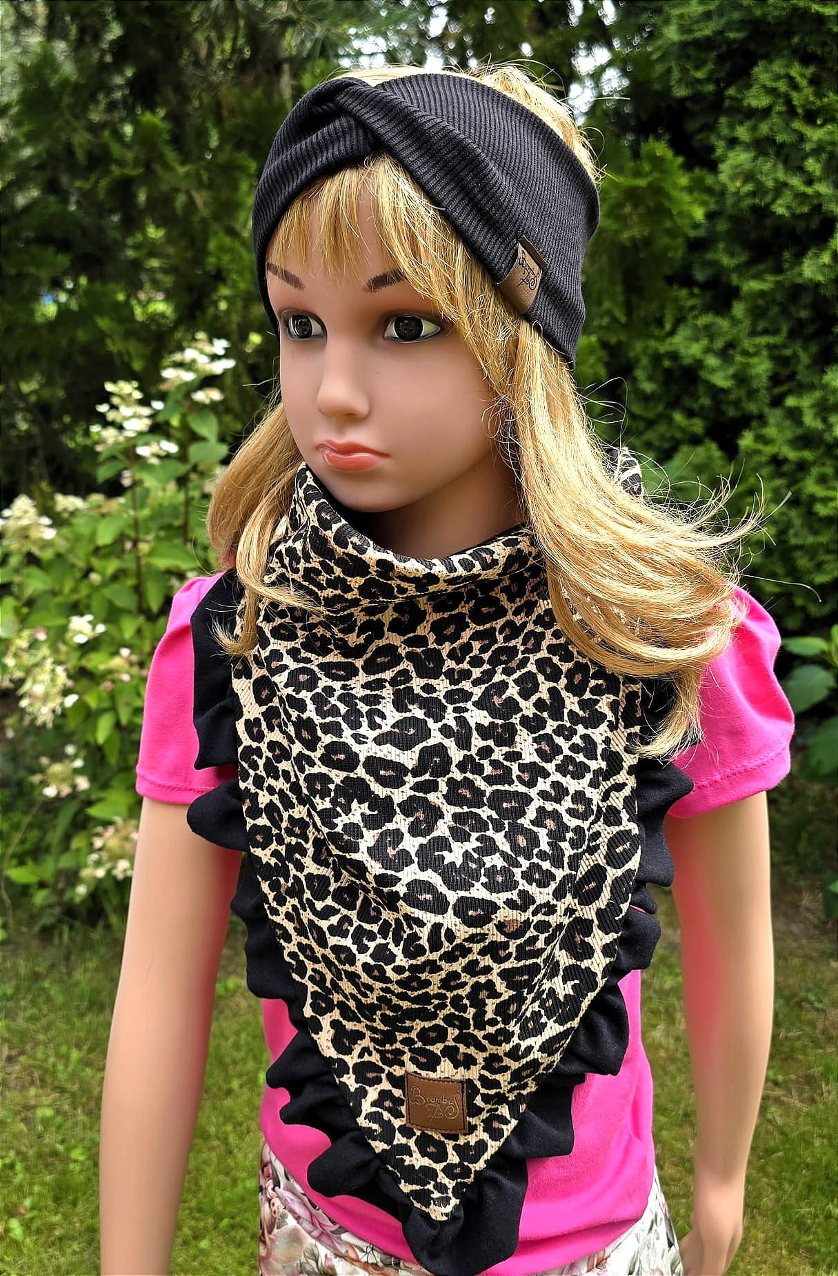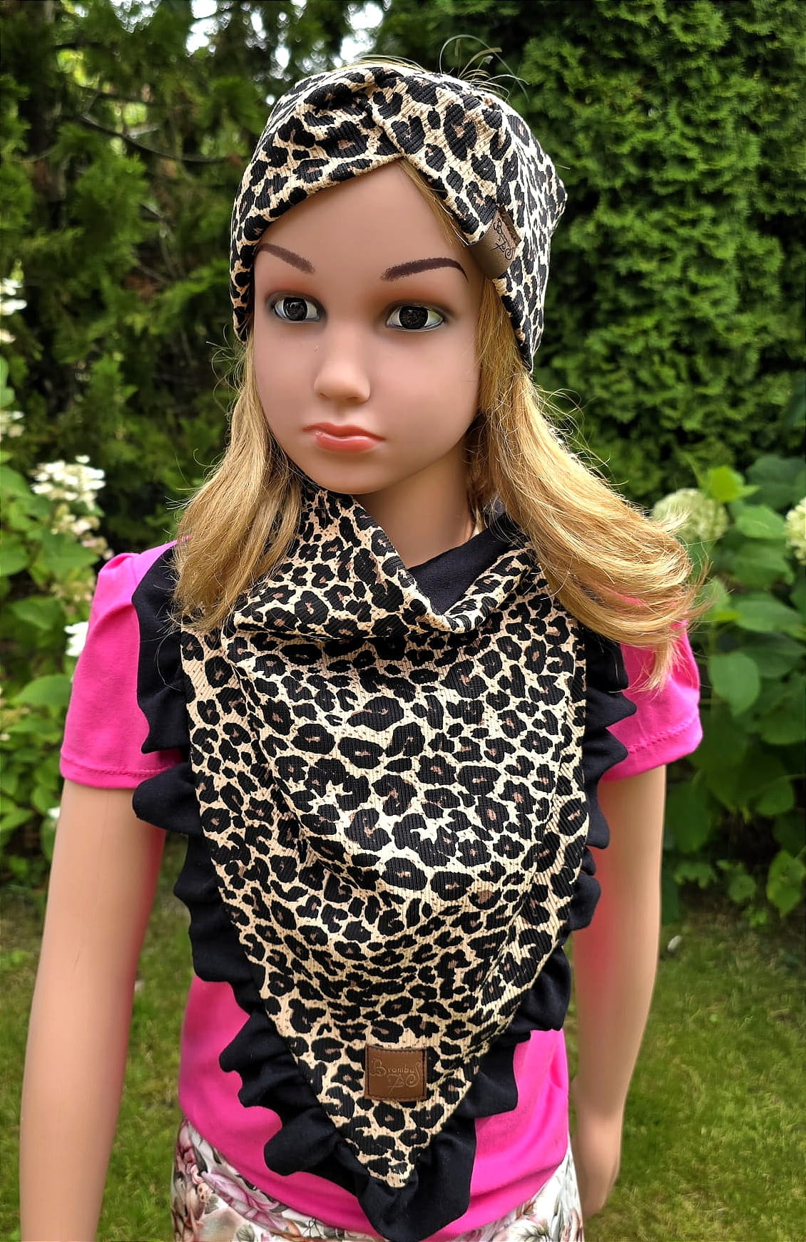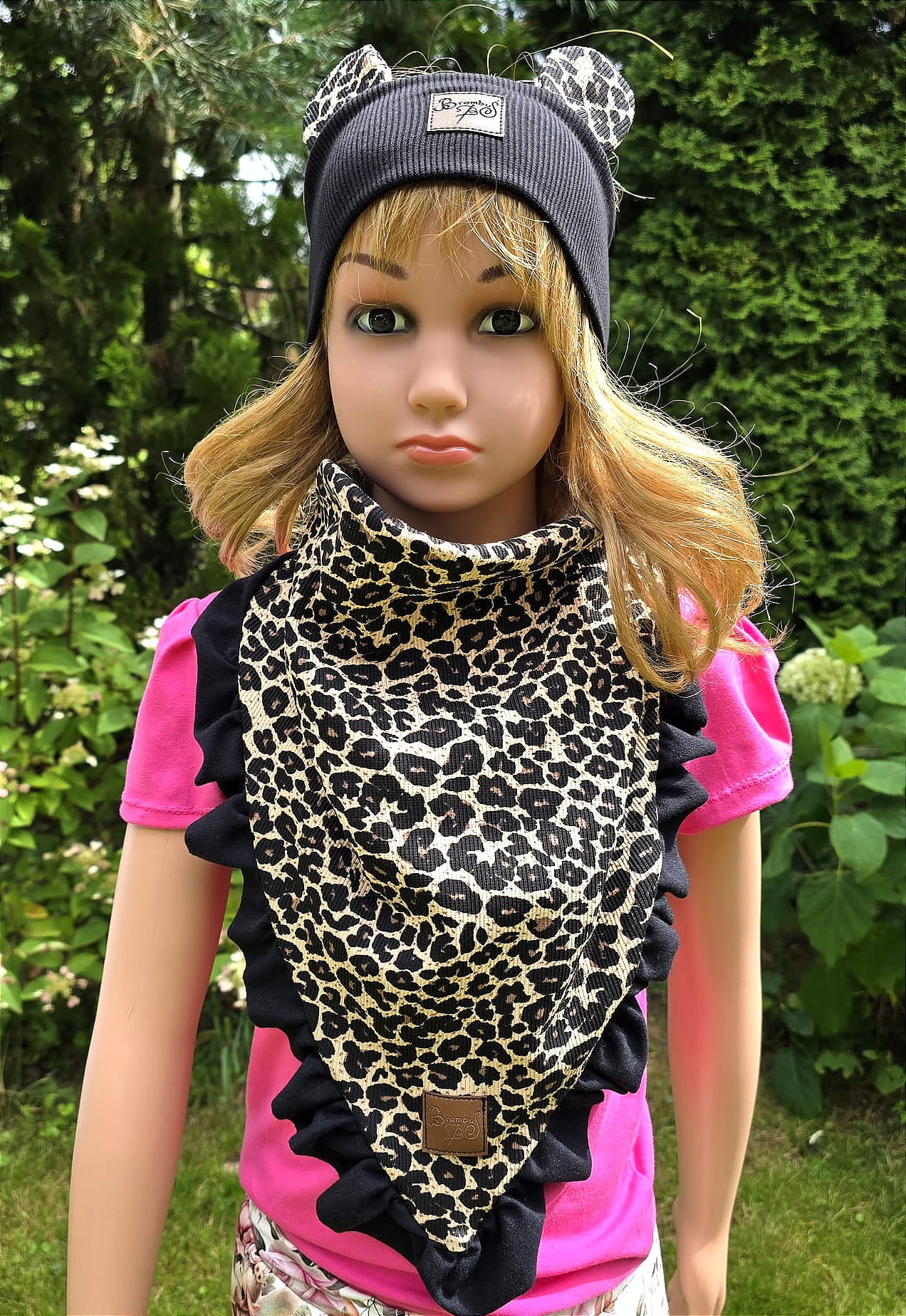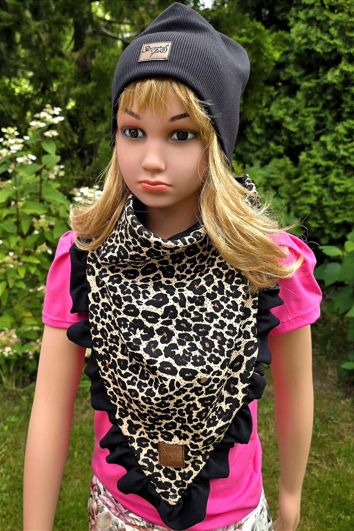 Stylowa chusta dziecięca w panterkę z falbanką – idealna jako osłona szyi i modny dodatek na jesień i wiosnę.
