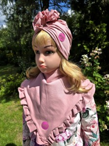 Delikatna chusta dziecięca w kolorze różowym, wykończona ozdobną falbanką, uszyta z miękkiej dzianiny.