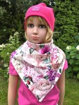 Chusta trójkątna w kwiaty to propozycja dla dzieci, które lubią wyróżniać się kolorem i wzorem. Zewnętrzna warstwa została uszyta z elastycznej, wysokogatunkowej dzianiny bawełnianej z pięknym motywem róż i piwonii, a wnętrze wykończono przyjemną dla skóry podszewką w kolorze pudrowego różu. Chusta świetnie chroni szyję przed wiatrem i chłodem, sprawdzi się wczesną jesienią, zimą i wiosną.