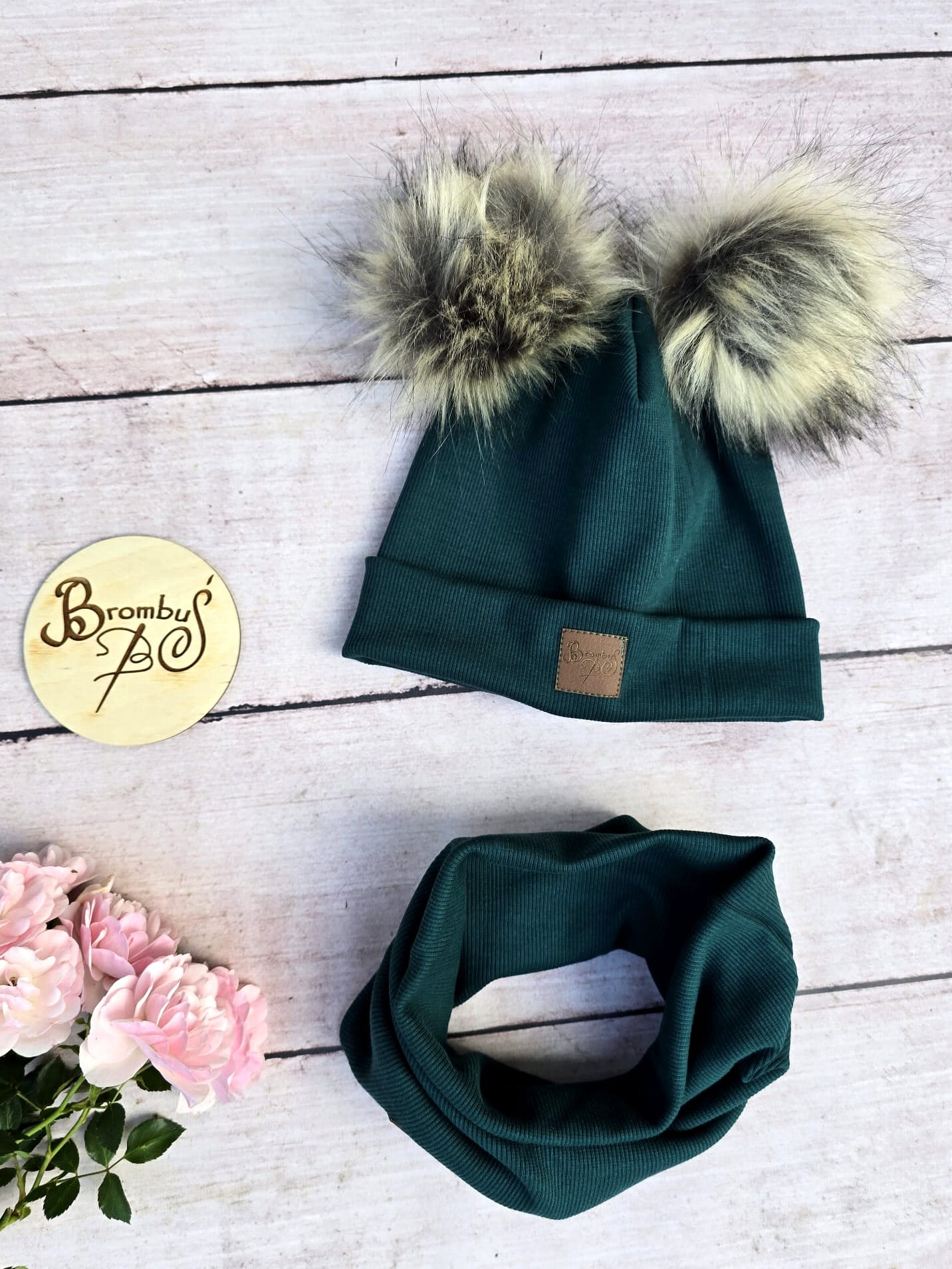 Czapka dziewczęca w kolorze butelkowej zieleni z dwoma pomponami z eko-futerka.