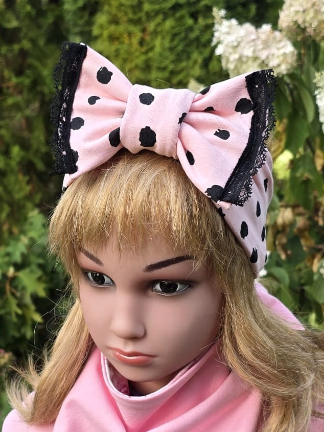 Stylowa opaska dziewczęca w różowe groszki z dużą kokardą ozdobioną koronką. Idealna jako uroczy dodatek do codziennych stylizacji i eleganckich zestawów.
