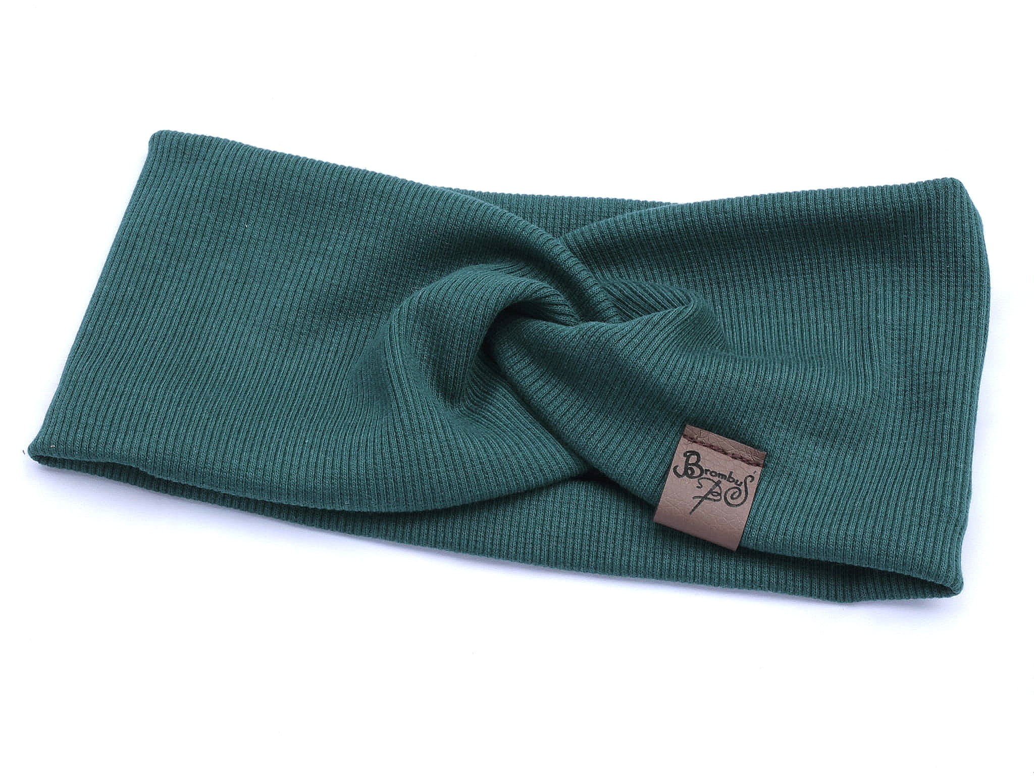 Klasyczna opaska z prążkowanej dzianiny w kolorze butelkowej zieleni. Ręcznie szyta, miękka i elastyczna.