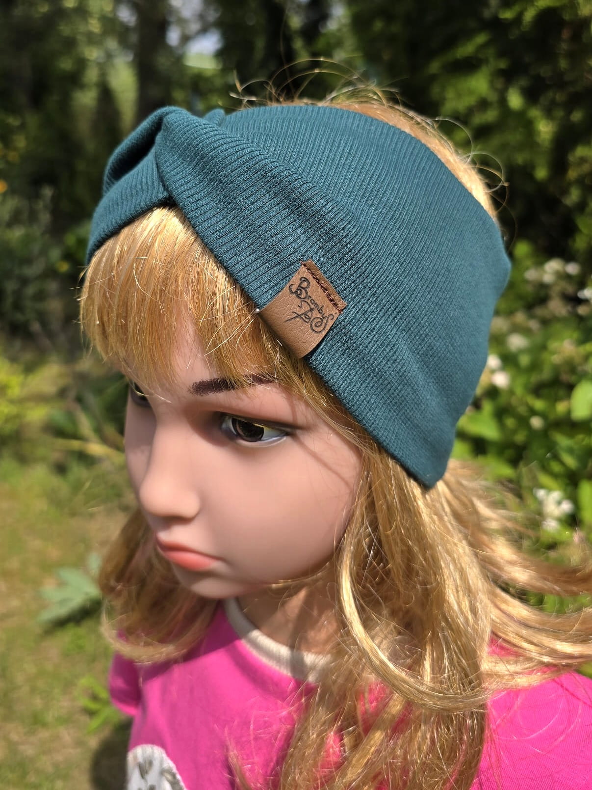 Opaska dziecięca wykonana z wysokiej jakości dzianiny prążkowanej w odcieniu butelkowej zieleni. Elastyczna i przyjemna w dotyku – dopasowuje się do głowy dziecka, zapewniając wygodę i swobodę ruchów.