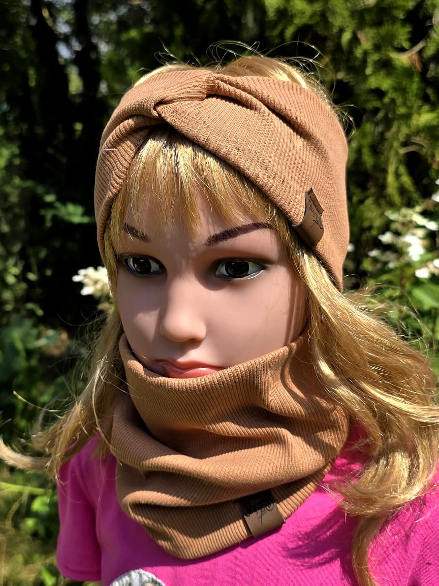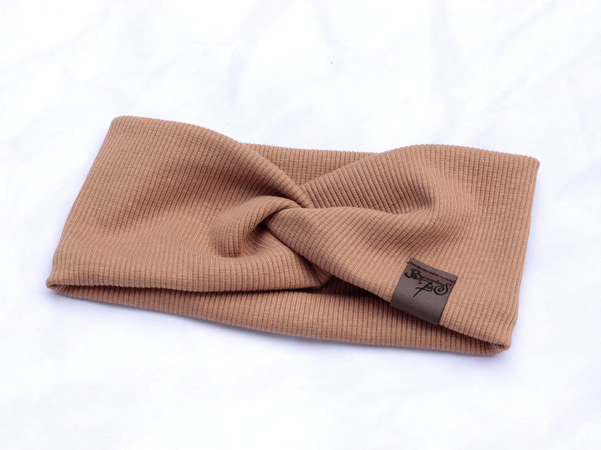 Opaska z prążkowanej dzianiny w kolorze karmelowym. Wygodna, elastyczna i idealna na każdą porę roku.