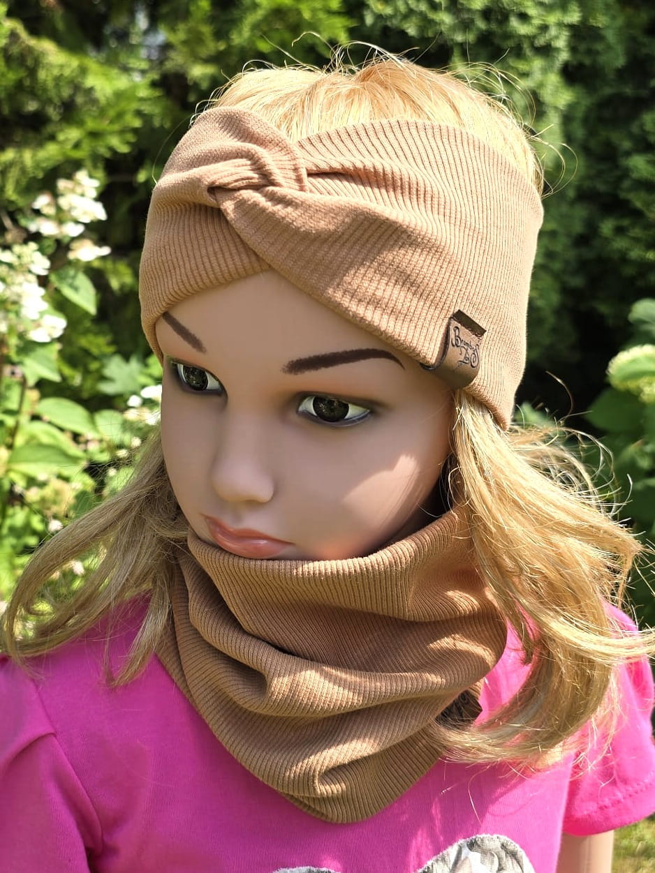 Miękka, elastyczna opaska dziecięca uszyta z wysokiej jakości prążkowanej dzianiny w kolorze karmelowym. Idealnie dopasowuje się do główki dziecka, zapewniając komfort noszenia zarówno w chłodniejsze, jak i cieplejsze dni.