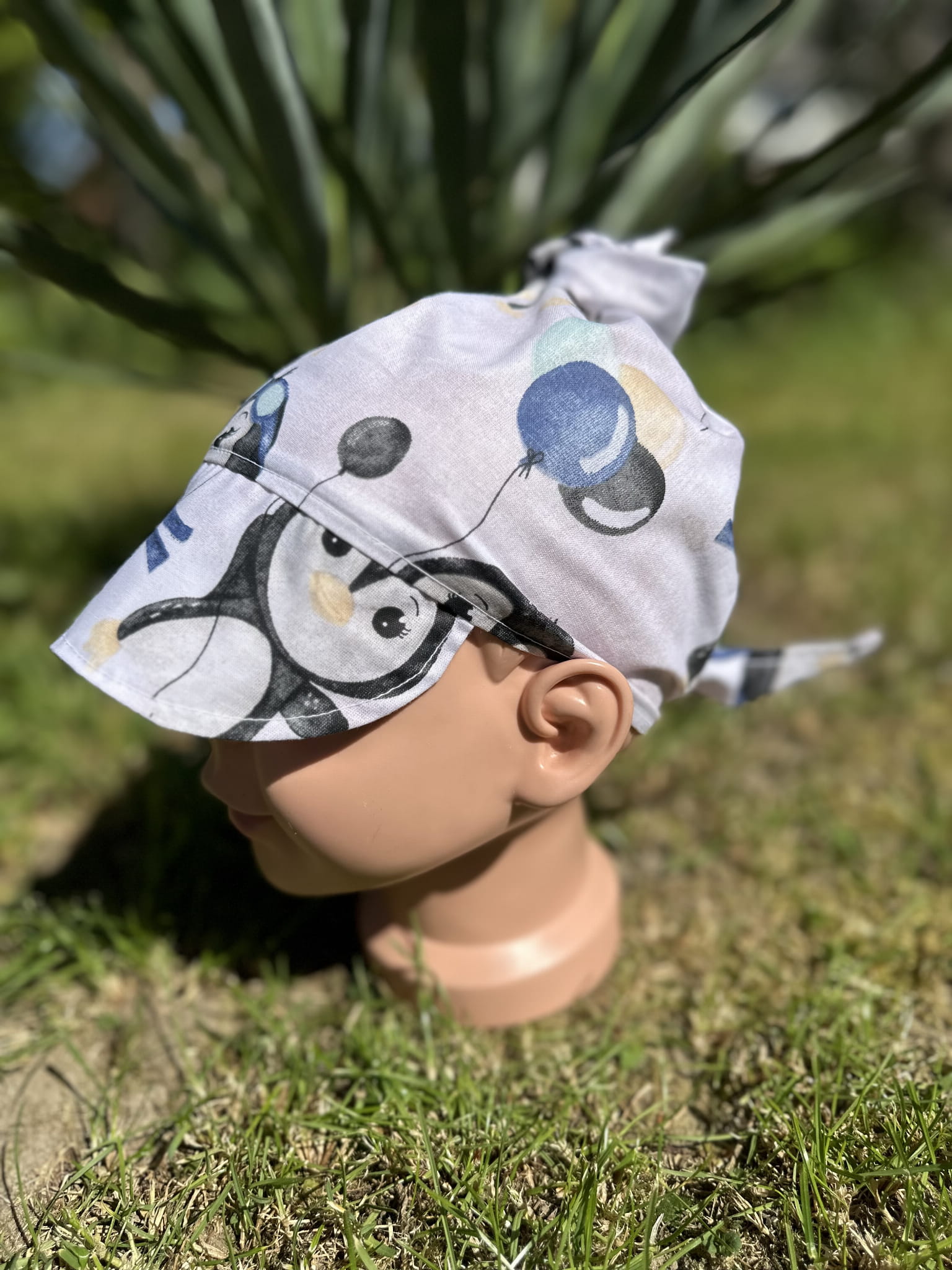 Ręcznie szyta chusta z daszkiem z uroczym wzorem pingwinków. Lekka, bawełniana i wygodna – idealna na słoneczne dni, by ochronić głowę dziecka i dodać mu stylu.
