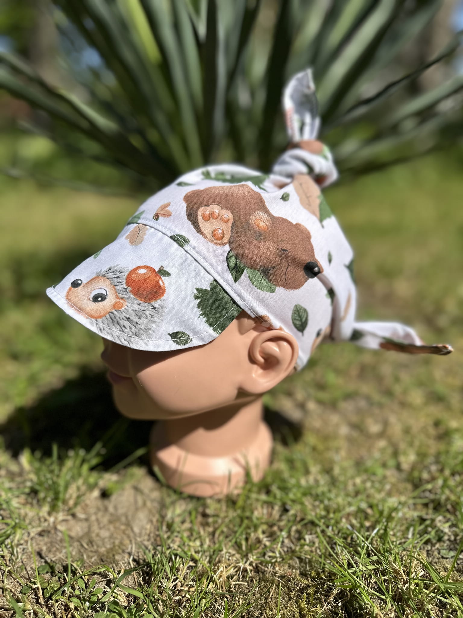 Urocza chusta z daszkiem z leśnymi zwierzątkami. Ręcznie szyta z lekkiej bawełny, idealna na spacery i przygody na świeżym powietrzu. Wygodna, bezpieczna, wyjątkowa.