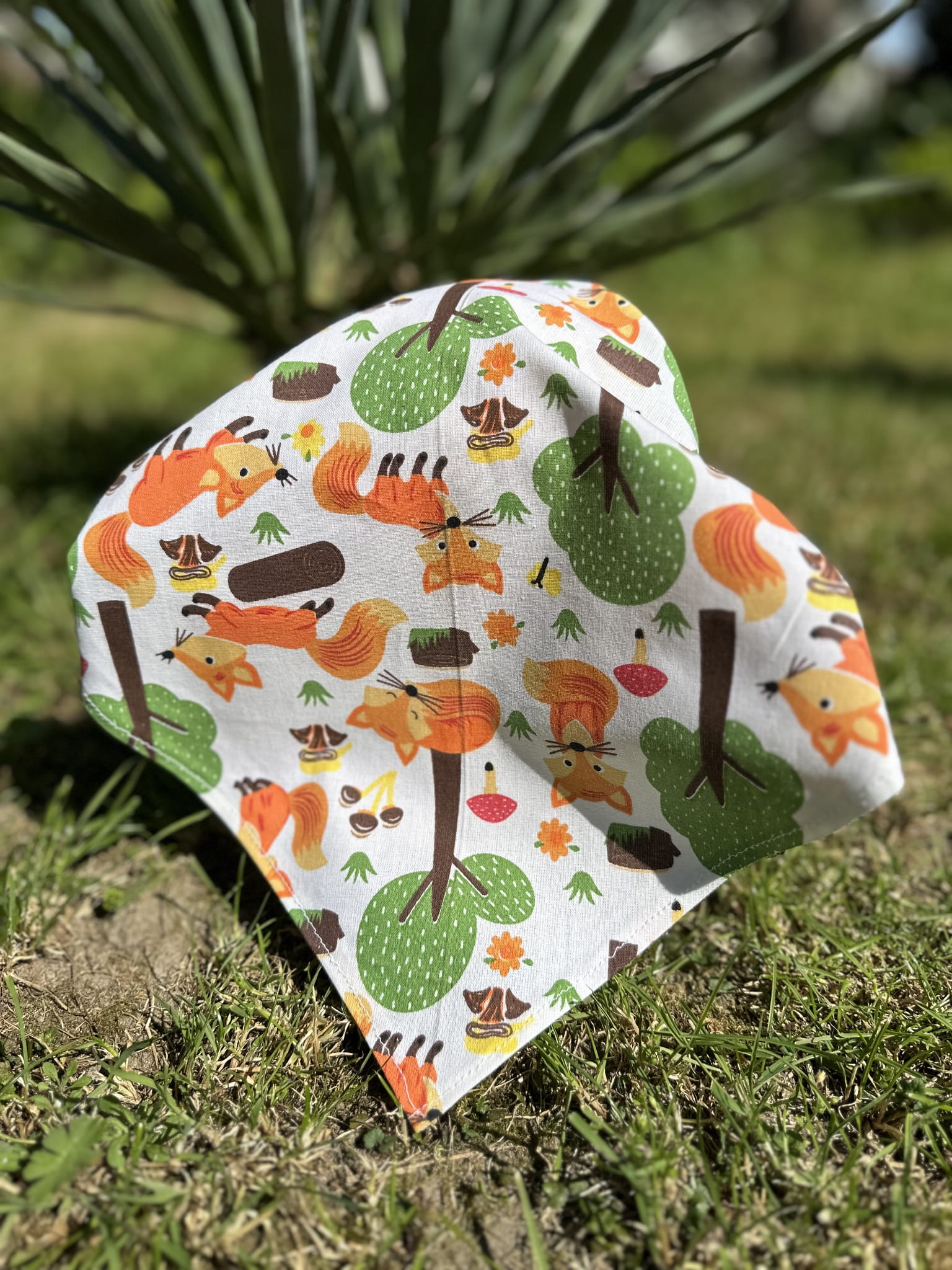 Lekka chusta z daszkiem uszyta ręcznie z tkaniny w radosne leśne motywy. Idealna na spacery, zabawy na świeżym powietrzu i ochronę przed słońcem.