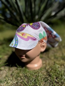 Kolorowa chusta z daszkiem z motylkami. Ręcznie szyta z lekkiej bawełny, idealna na słoneczne dni. Chroni główkę i dodaje stylu każdej letniej stylizacji.