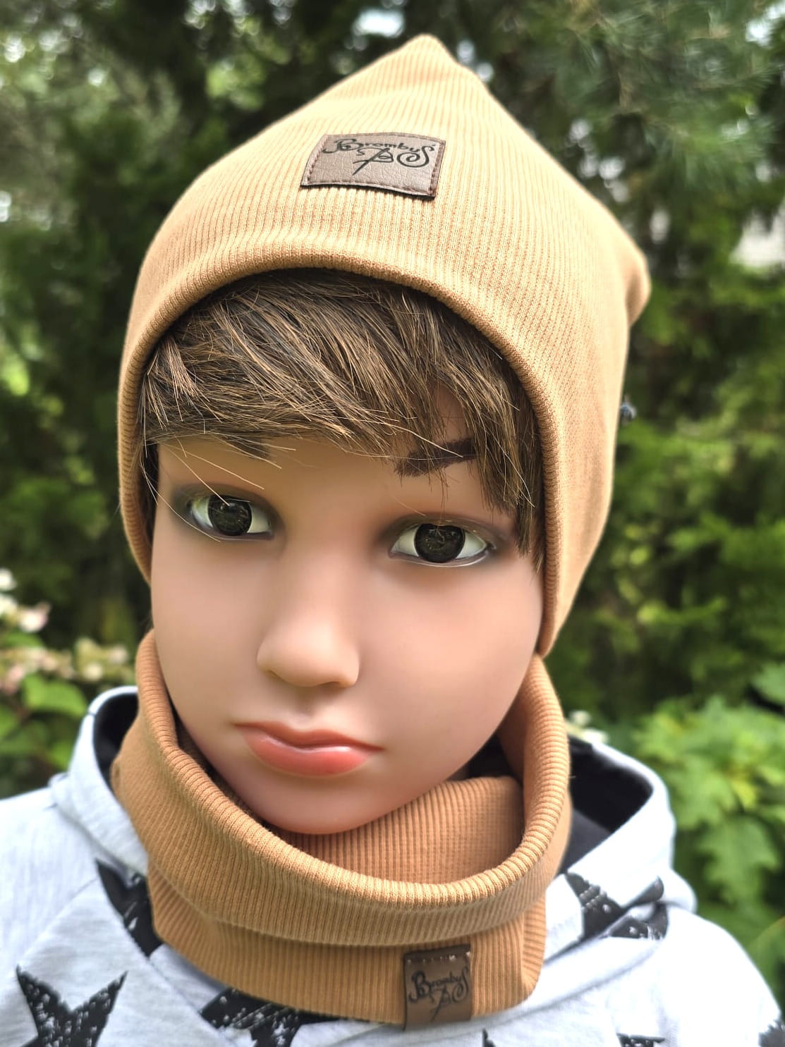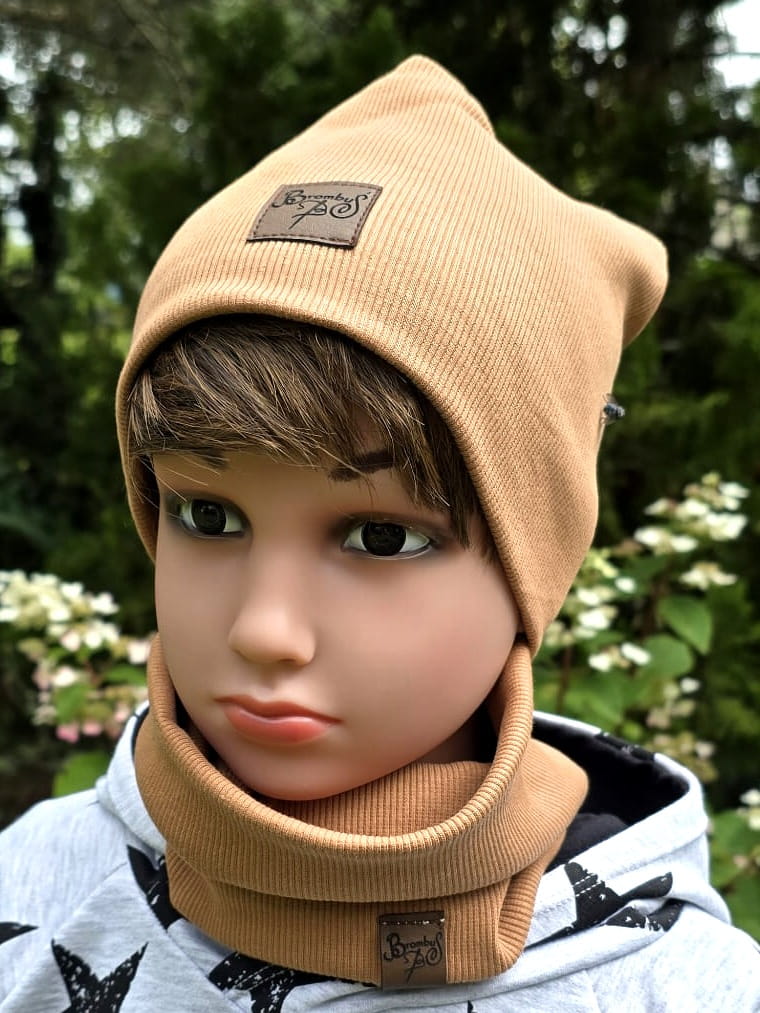 Miękka czapka dziecięca z prążkowanej dzianiny w kolorze karmelowym. Idealna na chłodniejsze dni – wygodna, elastyczna i stylowa.