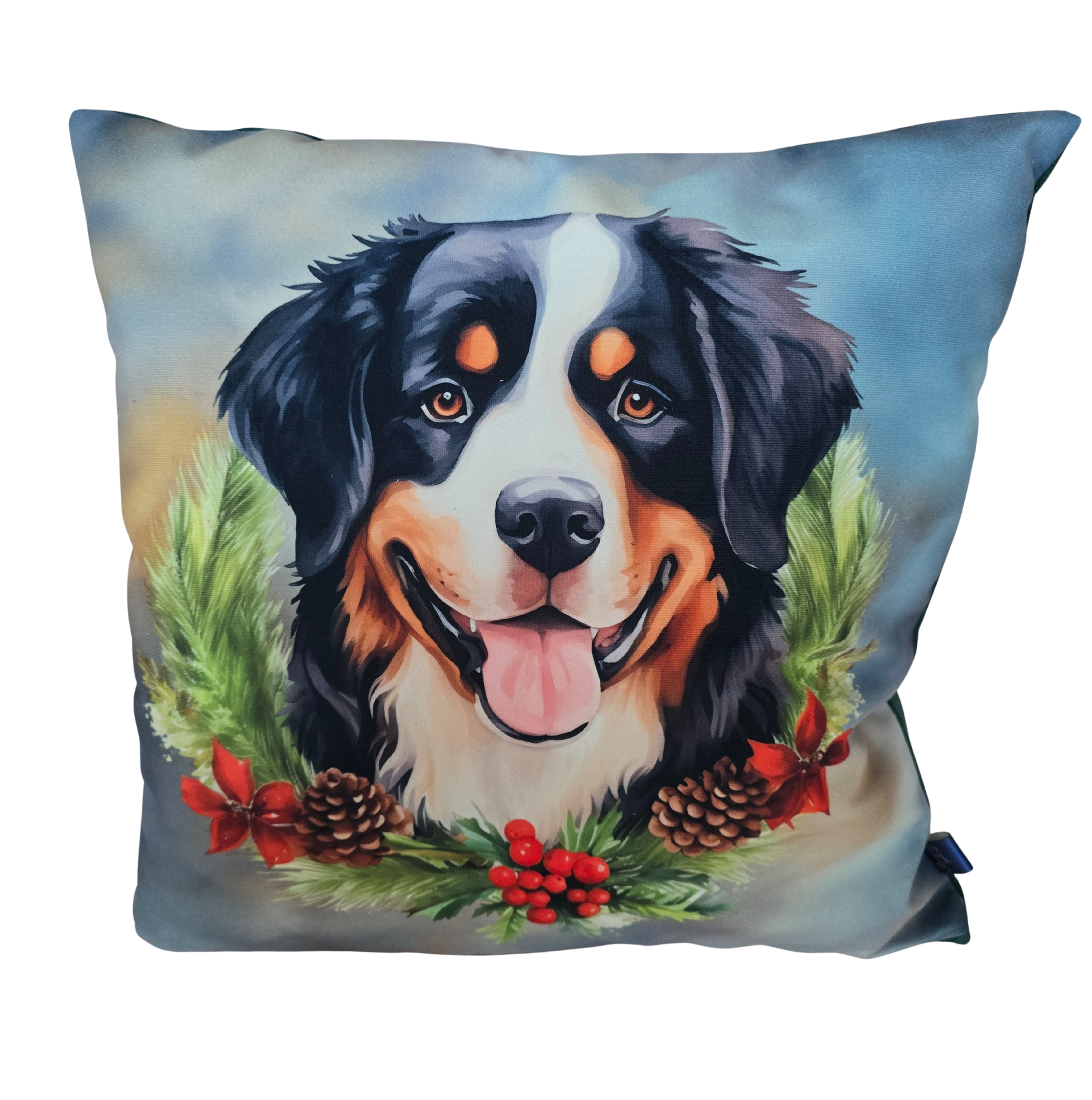 Poszewka dekoracyjna na jaśka z motywem berneńskiego psa pasterskiego, otoczonego zimową zielenią i świątecznymi akcentami. Idealna dla osób, które cenią spokój, rodzinne ciepło i wyjątkową więź z tym łagodnym, oddanym psem. Ten wzór doskonale trafi do miłośników berneńczyków, którzy chcą, aby ich wnętrze odzwierciedlało domową harmonię, naturę i zimowy klimat pełen serdeczności.