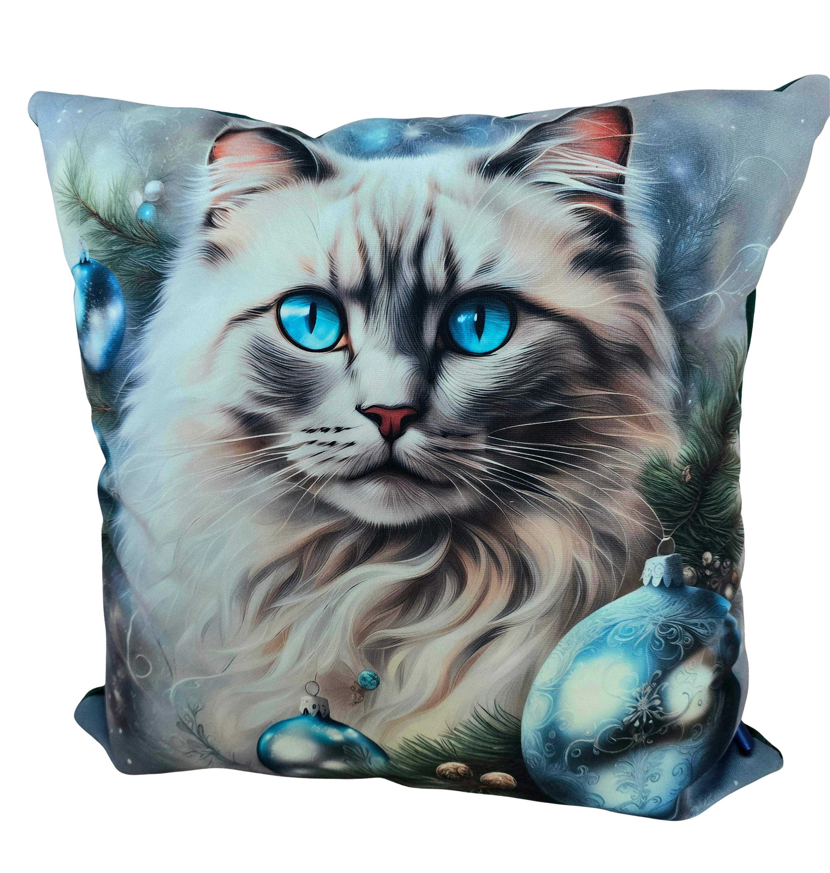 Dekoracyjna poszewka na jaśka z motywem kota ragdoll – idealna dla osób, które kochają spokój, delikatność i domowe ciepło. Jasna, puszysta sierść i intensywnie niebieskie oczy tworzą wyjątkowo spokojny, elegancki klimat, który pięknie dopełnia wnętrze. Doskonały wybór dla miłośników łagodnych, rodzinnych kotów oraz dla tych, którzy chcą dopasować dekoracje do charakteru swojego pupila.