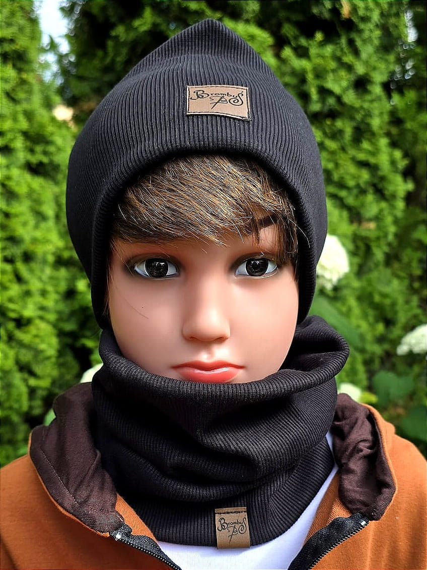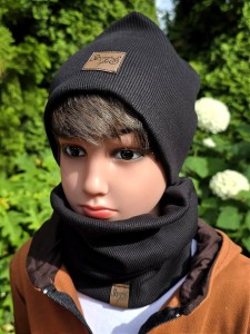Miękki i ciepły komin dziecięcy w kolorze czarnym, wykonany z elastycznej dzianiny prążkowanej. Świetna alternatywa dla szalika.