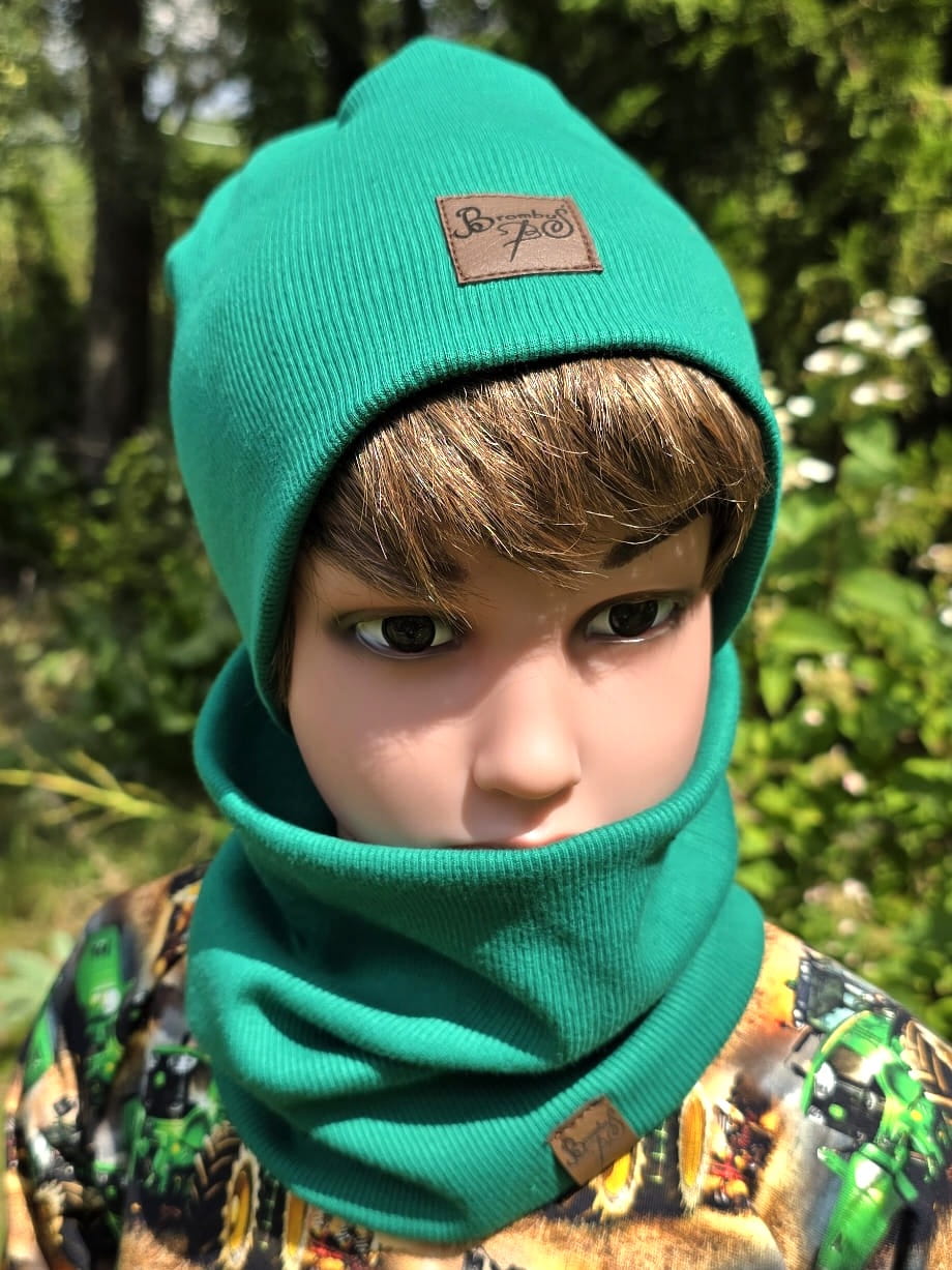 Czapka dziecięca w kolorze zielonym uszyta z wysokiej jakości dzianiny prążkowanej, która doskonale dopasowuje się do głowy i zapewnia komfort noszenia. Elastyczny materiał nie uciska, a zarazem dobrze chroni przed chłodem. Model z minimalistyczną naszywką BrombuŚ z przodu. Doskonały wybór na spacer, do przedszkola czy na wycieczkę.