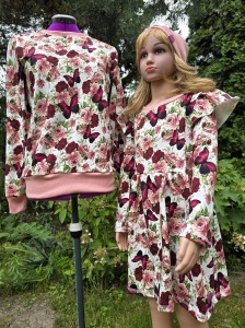 Urocza sukienka dziewczęca z falbankami, uszyta z miękkiej dresówki w motyli i róże. Idealna na co dzień i wyjątkowe okazje.