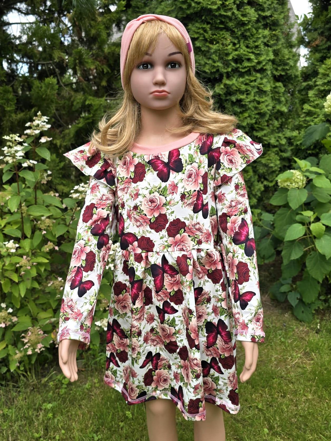 Sukienka dziewczęca w motyle i róże z falbankami