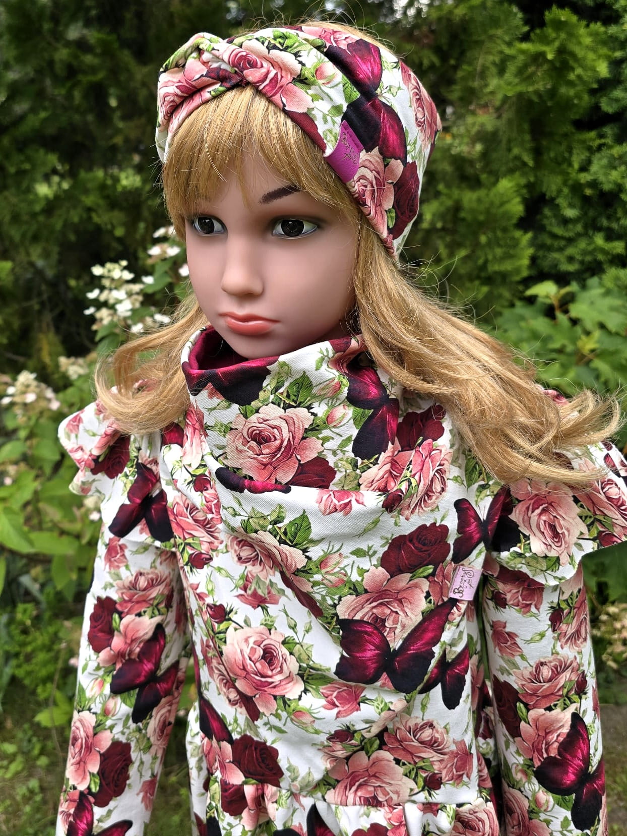 Falbanki na ramionach dodają lekkości i dziewczęcego uroku, a wzór pełen róż i motyli przyciąga uwagę i sprawia, że każda mała dama poczuje się wyjątkowo. Sukienka świetnie komponuje się z opaską czy chustą z tej samej kolekcji.