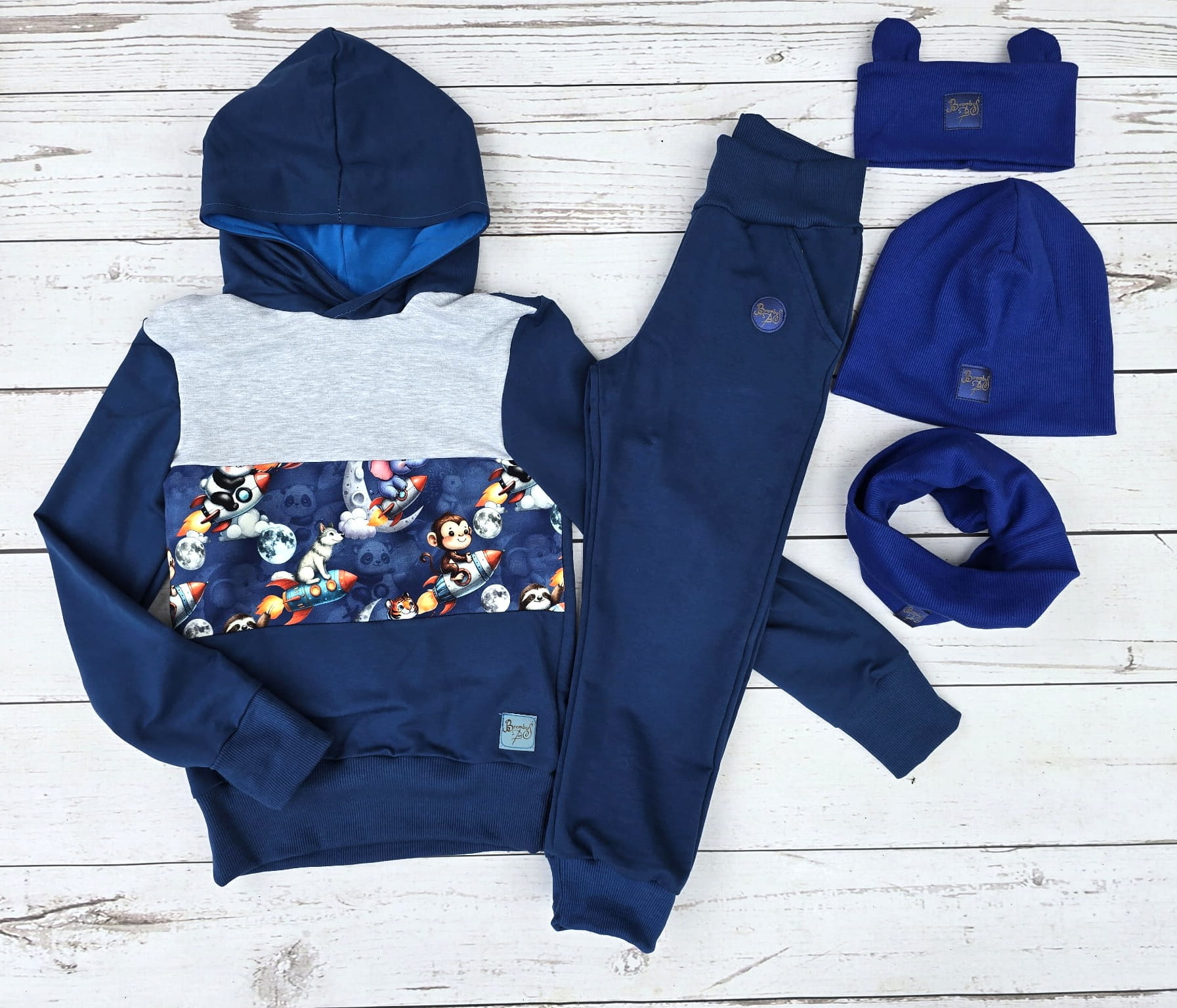 Dzięki uniwersalnemu kolorowi świetnie komponują się z wieloma bluzami i t-shirtami. Można je połączyć z bluzą, czapką i kominem w tym samym stylu, tworząc spójny, wyjątkowy zestaw dla dziecka.